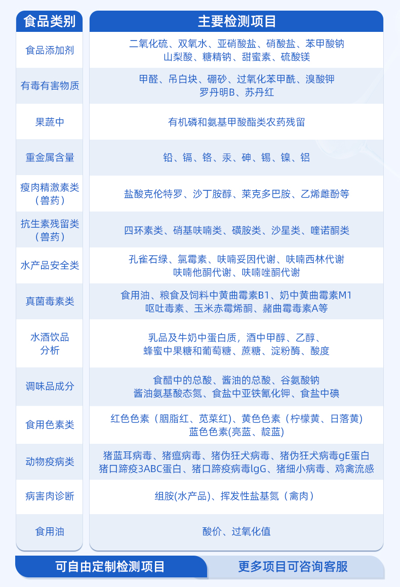 | 食品添加劑:二氧化硫、雙氧水、亞硝酸鹽、硝酸鹽、苯甲酸鈉、山梨酸、糖精鈉、甜蜜素、安賽蜜、硫酸鎂等 | 有毒有害物質(zhì):甲醛、吊白塊、硼砂、過氧化苯甲酰、溴酸鉀、羅丹明B、三聚氰胺、蘇丹紅等 | 果蔬中:有機(jī)磷和氨基甲酸酯類農(nóng)藥殘留; | 病害肉診斷:組胺、揮發(fā)性鹽基氮、肉制品酸價(jià)、水發(fā)產(chǎn)品中組胺 | 重金屬含量:鉛、鎘、鉻、汞、砷、錫、鎳、鋁等;食用油脂檢測:過氧化值、酸價(jià)、油脂丙二醛等。 | 瘦肉精激素類(獸藥):鹽酸克倫特羅、沙丁胺醇、萊克多巴胺、己烯雌酚、喹乙醇等 | 抗生素殘留類(獸藥):四環(huán)素類、硝基呋喃類、磺胺類、沙星類、喹諾酮類、慶大霉素、鏈霉素、阿莫西林、紅霉素等 | 水產(chǎn)品安全類:孔雀石綠、氯霉素、呋喃妥因代謝、呋喃西林代謝、呋喃它酮代謝、呋喃唑酮代謝等 | 真菌毒素類:食用油、糧食及飼料中黃曲霉毒素B1、奶中黃曲霉毒素M1、嘔吐毒素、玉米赤霉烯酮、赭曲霉毒素A等 | 水酒飲品分析:乳品及牛奶中蛋白質(zhì);酒中甲醇、乙醇、雜醇油;蜂蜜中果糖和葡萄糖、蔗糖、淀粉酶、酸度;水中氰化物、余氯,飲料中維C等 | 調(diào)味品成分:食醋的總酸、醬油的總酸、芝麻油純度、谷氨酸鈉、醬油氨基酸態(tài)氮、食鹽中亞鐵氰化鉀、食鹽中碘等 | 食用色素類:紅色色素(胭脂紅、莧菜紅、赤蘚紅、誘惑紅)、黃色色素(檸檬黃、日落黃)、藍(lán)色色素(亮藍(lán))等 | 動(dòng)物疫病類:豬藍(lán)耳病毒、豬瘟病毒、豬偽狂犬病毒、豬偽狂犬病毒gE蛋白、豬口蹄疫3ABC蛋白、豬口蹄疫病毒IgG、豬細(xì)小病毒、雞禽流感等 |