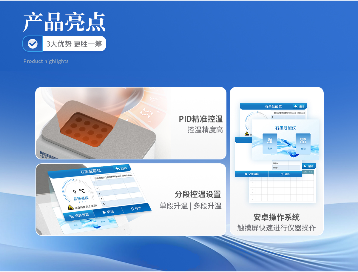 使用5寸彩色觸摸屏進(jìn)行儀器操作,配備安卓操作系統(tǒng),方便快捷。 采用PID 控溫技術(shù),控溫精度高,升溫速度快, 從室溫到260℃僅需25分鐘。 分段控溫設(shè)置,即可單段升溫,也可多段升溫,設(shè)置靈活,儀器將自動按順序完成。更適于易產(chǎn)生泡沫的樣品。 采用優(yōu)質(zhì)石墨爐內(nèi)芯,平均溫差較小,樣品效果一致性好,熱傳導(dǎo)效率更高。石墨塊具有特氟龍涂層,耐腐蝕,延長使用壽命。