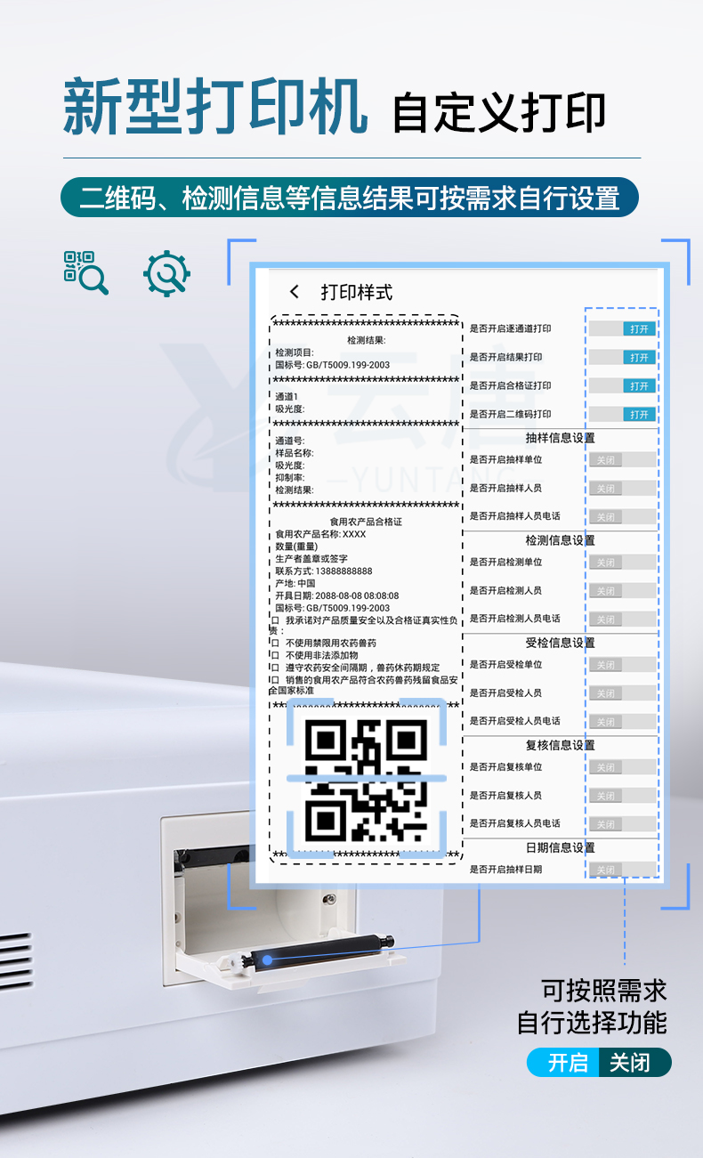 儀器采用臺(tái)式一體化系統(tǒng)檢測(cè)技術(shù),將分光光度模塊、膠體金檢測(cè)模塊、新型農(nóng)殘檢測(cè)模塊、數(shù)字化管理模塊、無(wú)線通訊模塊高度集成于一體,支持檢測(cè)200種食品安全檢測(cè)項(xiàng)目,同時(shí)預(yù)留升級(jí)檢測(cè)方法。儀器檢測(cè)模塊標(biāo)準(zhǔn)化、智能化,可隨意自由組合。檢測(cè)箱體內(nèi)置多個(gè)標(biāo)準(zhǔn)檢測(cè)單元,檢測(cè)模塊可以調(diào)整配置。顯示屏幕:儀器采用10.1英寸豎向液晶觸摸屏顯,搭配運(yùn)行安卓智能操作系統(tǒng),主控芯片采用ARM Cortex-A7,RK3288/4核處理器,主頻1.88Ghz,操作方便,性能更強(qiáng)。檢測(cè)通道:≥12通道;采用精密旋轉(zhuǎn)比色池設(shè)計(jì),使用同芯片同光源校準(zhǔn)精度,解決不同光源之間的誤差值。1-12通道間誤差0.1%。(***:**202022821055.2)儀器光源:高精度進(jìn)口四波長(zhǎng)冷光源,每個(gè)通道均配置 410、520、590、630nm 波長(zhǎng)光源,標(biāo)配**的光路切換裝置,專利光路切換功能可實(shí)現(xiàn)64波長(zhǎng),并且所有檢測(cè)項(xiàng)目可實(shí)現(xiàn)所有通道同時(shí)檢測(cè)。設(shè)備可一鍵校準(zhǔn),自動(dòng)保存校準(zhǔn)數(shù)據(jù),自動(dòng)對(duì)比校驗(yàn),得到精準(zhǔn)光源,采用Android SP存儲(chǔ)數(shù)據(jù),光源數(shù)據(jù)永不丟失,方便每一次使用。通訊接口: 配備無(wú)線通信模塊、可選配4G(APN)通訊模塊和藍(lán)牙傳輸,同時(shí)具有雙USB接口以及RJ45網(wǎng)線接口,可以多方式實(shí)現(xiàn)數(shù)據(jù)保存及數(shù)據(jù)傳輸。存儲(chǔ)方式: 支持U盤存儲(chǔ),標(biāo)準(zhǔn)USB接口,免驅(qū)動(dòng)安裝。檢測(cè)結(jié)果存儲(chǔ)容量20萬(wàn)條以上,可生成Excel表格進(jìn)行拷貝,并具有登錄保護(hù)功能。智能化操作系統(tǒng):操作系統(tǒng):儀器可在同一檢測(cè)界面自動(dòng)對(duì)應(yīng)相關(guān)檢測(cè)通道,一次性選擇1-12個(gè)樣品名稱,無(wú)需退出界面,節(jié)省操作時(shí)間。并可以對(duì)每個(gè)通道屬性和樣品信息單獨(dú)進(jìn)行編輯,例如送檢單位、人員,檢測(cè)人員等,打印時(shí)勾選打印顯示。數(shù)據(jù)集成系統(tǒng):設(shè)備首頁(yè)自動(dòng)匯總分析檢測(cè)數(shù)據(jù),包含:周檢測(cè)數(shù)據(jù)、月檢測(cè)數(shù)據(jù),全部檢測(cè)總數(shù)量,均包含檢測(cè)總數(shù),合格數(shù),不合格數(shù),以及相關(guān)柱形分析圖,各項(xiàng)檢測(cè)數(shù)據(jù)一目了然,無(wú)需電腦查詢,更加快捷直觀。數(shù)據(jù)庫(kù)系統(tǒng):十幾項(xiàng)數(shù)據(jù)庫(kù)分類管理儀器:包含項(xiàng)目類型、項(xiàng)目數(shù)據(jù)、檢測(cè)數(shù)據(jù)、歷史記錄、國(guó)標(biāo)信息、曲線信息、采樣信息、檢測(cè)信息、受檢信息、復(fù)核信息、圖表信息、光源校準(zhǔn)信息、打印樣式信息、樣品庫(kù)信息等等,數(shù)據(jù)庫(kù)之間互相協(xié)調(diào)聯(lián)動(dòng)保證數(shù)據(jù)的真實(shí)完整性。同時(shí)產(chǎn)品數(shù)據(jù)庫(kù)以及歷史檢測(cè)記錄支持一鍵檢索功能。限量規(guī)判系統(tǒng):具有限量查詢、添加物質(zhì)合規(guī)判定系統(tǒng)。檢測(cè)出結(jié)果后,系統(tǒng)自動(dòng)調(diào)用系統(tǒng)數(shù)據(jù)庫(kù)中相關(guān)國(guó)標(biāo)進(jìn)行比對(duì)判定,客觀顯示判定結(jié)果是否合格。項(xiàng)目預(yù)設(shè)系統(tǒng):儀器具有任務(wù)預(yù)設(shè)模塊,一鍵提前預(yù)設(shè),給出方便快捷的新檢測(cè)方案,每一個(gè)任務(wù)分別可以設(shè)置不同的樣品、批次、編號(hào)、來(lái)源、備注、抽樣信息、檢測(cè)信息、受檢信息、復(fù)核信息等更多信息。樣品送檢時(shí)一鍵調(diào)取保存信息,并可多次調(diào)取,大大提高檢測(cè)效率。數(shù)據(jù)監(jiān)管系統(tǒng):同步對(duì)接監(jiān)管平臺(tái),數(shù)據(jù)可局域網(wǎng)和互聯(lián)網(wǎng)數(shù)據(jù)上傳,檢測(cè)結(jié)果可選擇直接傳至食品安全監(jiān)管平臺(tái)。進(jìn)行區(qū)域食品安全監(jiān)管及大數(shù)據(jù)分析處理與數(shù)據(jù)統(tǒng)計(jì),檢測(cè)區(qū)域食品安全長(zhǎng)短期動(dòng)態(tài),達(dá)到食品安全問題預(yù)估、預(yù)警。全新打印系統(tǒng):內(nèi)置全新打印機(jī),新創(chuàng)自定義打印方式,可按需靈活勾選控制:產(chǎn)品合格證(國(guó)家農(nóng)業(yè)部標(biāo)準(zhǔn)要求),二維碼,抽樣信息、檢測(cè)信息,受檢信息、復(fù)核信息、抽樣日期、檢測(cè)日期等信息的打印。A4紙版本報(bào)告打印功能(可選配):設(shè)備擁有兩種結(jié)果展示方式,可以自動(dòng)生成A4打印模板和小票打印模板兩種樣式,可通過(guò)WiFi及網(wǎng)線等方式鏈接外置打印機(jī)可進(jìn)行打印。供電模式:儀器交直流兩用,直流12V供電,可連接車載電源,可配6ah大容量充電鋰電池,電量可實(shí)時(shí)顯示,方便戶外流動(dòng)測(cè)試。膠體金檢測(cè)模塊:采用雙通道CMOS成像處理技術(shù)及膠體金免疫層析技術(shù),可同時(shí)讀取雙膠體金卡數(shù)據(jù),自動(dòng)采集、處理分析,將檢測(cè)結(jié)果顯示,并可根據(jù)參考限值自動(dòng)判斷檢測(cè)結(jié)果,可檢測(cè)常見的獸藥殘留、生物毒素、抗生素、違禁添加