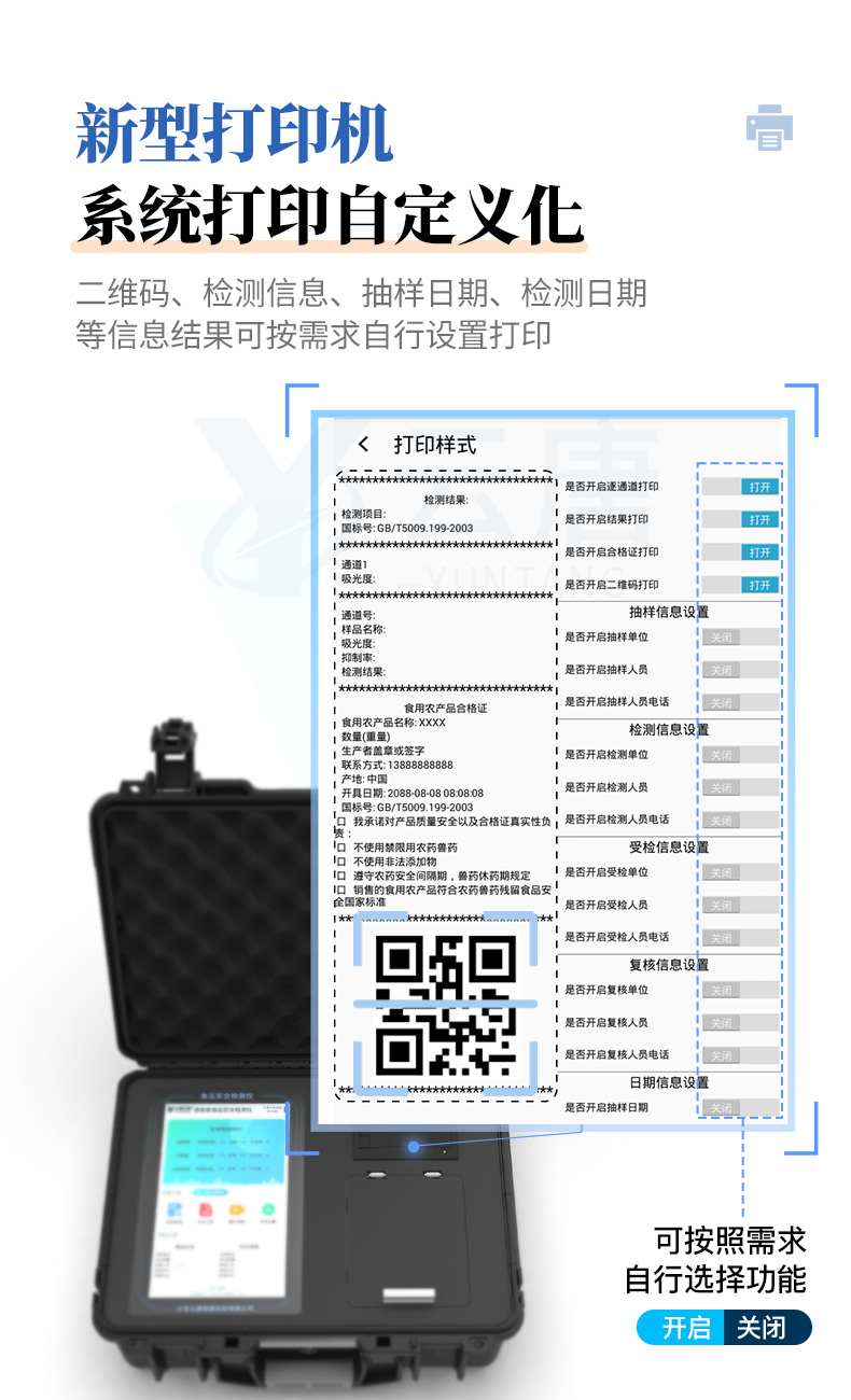 | 儀器采用手提式一體化系統(tǒng)檢測(cè)技術(shù),將分光光度模塊、膠體金檢測(cè)模塊、新型農(nóng)殘檢測(cè)模塊、數(shù)字化管理模塊、無(wú)線通訊模塊高度集成于一體,支持檢測(cè)200種食品安全檢測(cè)項(xiàng)目,同時(shí)預(yù)留升級(jí)檢測(cè)方法。 | 儀器檢測(cè)模塊標(biāo)準(zhǔn)化、智能化,檢測(cè)項(xiàng)目可隨意自由組合。檢測(cè)箱體內(nèi)置多個(gè)標(biāo)準(zhǔn)檢測(cè)單元,檢測(cè)模塊可以調(diào)整配置。 | 顯示屏幕:儀器采用10.1英寸豎向液晶觸摸屏顯,搭配運(yùn)行安卓智能操作系統(tǒng),主控芯片采用ARM Cortex-A7,RK3288/4核處理器,主頻1.88Ghz,操作方便,性能更強(qiáng)。 | 檢測(cè)通道:≥12通道;采用精密旋轉(zhuǎn)比色池設(shè)計(jì),使用同芯片同光源校準(zhǔn)精度,解決不同光源之間的誤差值,更加準(zhǔn)確**。(1-12通道間誤差0.1%,***:**202022821055.2) | 儀器光源:高精度進(jìn)口四波長(zhǎng)冷光源,每個(gè)通道均配置 410、520、590、630nm 波長(zhǎng)光源,標(biāo)配**的光路切換裝置,專利光路切換功能可實(shí)現(xiàn)64波長(zhǎng),并且所有檢測(cè)項(xiàng)目可實(shí)現(xiàn)所有通道同時(shí)檢測(cè)。 | 設(shè)備可一鍵校準(zhǔn),自動(dòng)保存校準(zhǔn)數(shù)據(jù),自動(dòng)對(duì)比校驗(yàn),得到精準(zhǔn)光源,采用Android SP存儲(chǔ)數(shù)據(jù),光源數(shù)據(jù)永不丟失,方便每一次使用。 | 通訊接口:配備無(wú)線通信模塊、4G(APN)通訊模塊、藍(lán)牙傳輸,同時(shí)具有雙USB接口以及RJ45網(wǎng)線接口,可以多方式實(shí)現(xiàn)數(shù)據(jù)保存及數(shù)據(jù)傳輸。 | 存儲(chǔ)方式:支持U盤存儲(chǔ),標(biāo)準(zhǔn)USB接口,免驅(qū)動(dòng)安裝。檢測(cè)結(jié)果存儲(chǔ)容量20萬(wàn)條以上,可生成Excel表格進(jìn)行拷貝,并具有登錄保護(hù)功能。 | 智能化操作系統(tǒng):: ★操作系統(tǒng):儀器可在同一檢測(cè)界面自動(dòng)對(duì)應(yīng)相關(guān)檢測(cè)通道,一次性選擇1-12個(gè)樣品名稱,無(wú)需退出界面,節(jié)省操作時(shí)間。并可以對(duì)每個(gè)通道屬性和樣品信息單獨(dú)進(jìn)行編輯,例如送檢單位、人員,檢測(cè)人員等,打印時(shí)勾選打印顯示。 | ★數(shù)據(jù)集成系統(tǒng):設(shè)備首頁(yè)自動(dòng)匯總分析檢測(cè)數(shù)據(jù),包含:周檢測(cè)數(shù)據(jù)、月檢測(cè)數(shù)據(jù),全部檢測(cè)總數(shù)量,均包含檢測(cè)總數(shù),合格數(shù),不合格數(shù),以及相關(guān)柱形分析圖,各項(xiàng)檢測(cè)數(shù)據(jù)一目了然,無(wú)需電腦查詢,更加快捷直觀。 | ★數(shù)據(jù)庫(kù)系統(tǒng):十幾項(xiàng)數(shù)據(jù)庫(kù)分類管理儀器:包含項(xiàng)目類型、項(xiàng)目數(shù)據(jù)、檢測(cè)數(shù)據(jù)、歷史記錄、國(guó)標(biāo)信息、曲線信息、采樣信息、檢測(cè)信息、受檢信息、復(fù)核信息、圖表信息、光源校準(zhǔn)信息、打印樣式信息、樣品庫(kù)信息等等,數(shù)據(jù)庫(kù)之間互相協(xié)調(diào)聯(lián)動(dòng)保證數(shù)據(jù)的真實(shí)完整性。同時(shí)產(chǎn)品數(shù)據(jù)庫(kù)以及歷史檢測(cè)記錄支持一鍵檢索功能。 | ★限量規(guī)判系統(tǒng):具有限量查詢、添加物質(zhì)合規(guī)判定系統(tǒng)。檢測(cè)出結(jié)果后,系統(tǒng)自動(dòng)調(diào)用系統(tǒng)數(shù)據(jù)庫(kù)中相關(guān)國(guó)標(biāo)進(jìn)行比對(duì)判定,客觀顯示判定結(jié)果是否合格 | ★項(xiàng)目預(yù)設(shè)系統(tǒng):儀器具有任務(wù)預(yù)設(shè)模塊,一鍵提前預(yù)設(shè),給出方便快捷的新檢測(cè)方案,每一個(gè)任務(wù)分別可以設(shè)置不同的樣品、批次、編號(hào)、來(lái)源、備注、抽樣信息、檢測(cè)信息、受檢信息、復(fù)核信息等更多信息。樣品送檢時(shí)一鍵調(diào)取保存信息,并可多次調(diào)取,大大提高檢測(cè)效率。 | ★數(shù)據(jù)監(jiān)管系統(tǒng):同步對(duì)接監(jiān)管平臺(tái),數(shù)據(jù)可局域網(wǎng)和互聯(lián)網(wǎng)數(shù)據(jù)上傳,檢測(cè)結(jié)果可選擇直接傳至食品安全監(jiān)管平臺(tái)。進(jìn)行區(qū)域食品安全監(jiān)管及大數(shù)據(jù)分析處理與數(shù)據(jù)統(tǒng)計(jì),檢測(cè)區(qū)域食品安全長(zhǎng)短期動(dòng)態(tài),達(dá)到食品安全問(wèn)題預(yù)估、預(yù)警。 | ★打印系統(tǒng):內(nèi)置全新打印機(jī),新創(chuàng)自定義打印方式,可按需靈活勾選控制:產(chǎn)品合格證(國(guó)家農(nóng)業(yè)部標(biāo)準(zhǔn)要求),二維碼,抽樣信息、檢測(cè)信息,受檢信息、復(fù)核信息、抽樣日期、檢測(cè)日期等信息的打印。 | 供電模式:儀器交直流兩用,直流12V供電,可連接車載電源,可配6ah大容量充電鋰電池,電量可實(shí)時(shí)顯示,方便戶外流動(dòng)測(cè)試。 | 膠體金檢測(cè)模塊:采用雙通道CMOS成像處理技術(shù)及膠體金免疫層析技術(shù),可同時(shí)讀取雙膠體金卡數(shù)據(jù),自動(dòng)采集、處理分析,將檢測(cè)結(jié)果顯示,并可根據(jù)參考限值自動(dòng)判斷檢測(cè)結(jié)果,可檢測(cè)常見的獸藥殘留、生物毒素、抗生素、違禁添加物等。 | ★探測(cè)技術(shù):CMOS成像探測(cè); | ★檢測(cè)通道:1個(gè)通道; | ★檢測(cè)方式:消線法和比色法; | ★顯示模