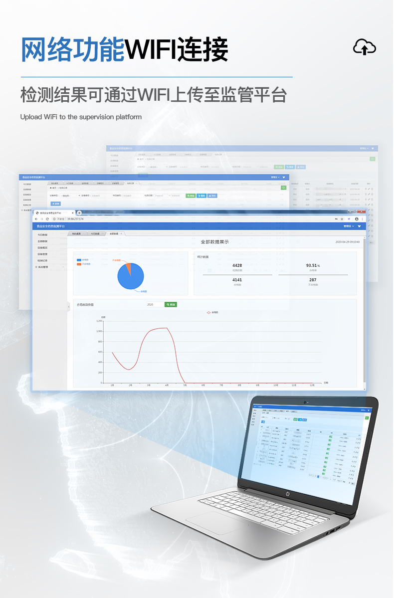 | 儀器采用臺式一體化系統(tǒng)檢測技術(shù),將分光光度模塊、新型農(nóng)殘檢測模塊、數(shù)字化管理模塊、無線通訊模塊高度集成于一體,支持檢測200種食品安全檢測項(xiàng)目,同時預(yù)留升級檢測方法。 | 儀器檢測模塊標(biāo)準(zhǔn)化、智能化,可隨意自由組合。檢測箱體內(nèi)置多個標(biāo)準(zhǔn)檢測單元,檢測模塊可以調(diào)整配置。 | 儀器采用全新安卓智能系統(tǒng),主控芯片采用 ARM Cortex-A7,RK3288/4核處理器,10.1寸高清液晶觸摸豎屏,更加**的UI交互界面,運(yùn)轉(zhuǎn)快捷;儀器配備無線通信模塊: 4G(APN)通訊模塊、Wifi模塊,藍(lán)牙傳輸,同時具有雙USB接口以及RJ45接口能以多種方式實(shí)現(xiàn)數(shù)據(jù)保存和數(shù)據(jù)傳輸功能。 | 創(chuàng)新檢測模式: | ★檢測通道:≥12通道;采用精密旋轉(zhuǎn)比色池設(shè)計(jì),使用同芯片同光源校準(zhǔn)精度,解決不同光源之間的誤差值。1-12通道間誤差0.1%。(***:**202022821055.2) | ★儀器具有自動識別比色皿檢測功能,即:將樣品比色皿放入儀器后,點(diǎn)擊樣品檢測,儀器自動識別比色皿進(jìn)行通道檢測。 | 進(jìn)口高精光源: | 高精度進(jìn)口四波長冷光源,通道配置 410、520、590、630nm 波長光源,一個光源芯片驅(qū)動一個光源,誤差極小,每臺設(shè)備單獨(dú)**校準(zhǔn)光源,**比對,同時參照四種不同波段光源全方位覆蓋市面上99%的農(nóng)殘食品項(xiàng)目檢測。 | 智能化操作系統(tǒng): | 便捷操作系統(tǒng):設(shè)備檢測時可在同一檢測界面自動對應(yīng)相關(guān)檢測通道一次性選擇1-12個樣品名稱,無須退出界面,節(jié)省操作時間。 | 數(shù)據(jù)集成系統(tǒng):設(shè)備首頁自動統(tǒng)計(jì)檢測數(shù)據(jù)包含:周檢測數(shù)據(jù)、月檢測數(shù)據(jù),全部檢測總數(shù)量,均包含檢測總數(shù),合格數(shù),不合格數(shù),以及相關(guān)柱形分析圖,對各項(xiàng)檢測數(shù)據(jù)清晰掌握,無需電腦查詢,更加快捷直觀。 | 項(xiàng)目預(yù)設(shè)系統(tǒng):支持添加單個及多個相同或不相同的任務(wù)預(yù)設(shè),一鍵快速調(diào)取,每一個任務(wù)分別可以設(shè)置不同的樣品、批次、編號、來源、備注、抽樣信息、檢測信息、受檢信息、復(fù)核信息等更多信息。無縫鏈接平臺和APP實(shí)時查看下發(fā)任務(wù)。 | 數(shù)據(jù)監(jiān)管系統(tǒng):同步對接監(jiān)管平臺,數(shù)據(jù)可局域網(wǎng)和互聯(lián)網(wǎng)數(shù)據(jù)上傳,檢測結(jié)果可選擇直接傳至食品安全監(jiān)管平臺。集成OSS輸出存儲服務(wù)、區(qū)分設(shè)備定向管理應(yīng)用,進(jìn)行區(qū)域食品安全監(jiān)管及大數(shù)據(jù)分析處理與數(shù)據(jù)統(tǒng)計(jì),檢測區(qū)域食品安全長短期動態(tài),達(dá)到食品安全問題預(yù)估、預(yù)警。 | 自定義打印系統(tǒng):內(nèi)置全新打印系統(tǒng),新創(chuàng)自定義打印方式,可按需靈活設(shè)置開啟或關(guān)閉:產(chǎn)品合格證(國家農(nóng)業(yè)部標(biāo)準(zhǔn)要求),二維碼,抽樣信息、檢測信息,受檢信息、復(fù)核信息、抽樣日期、檢測日期等信息的打印。 | 系統(tǒng)遠(yuǎn)程更新功能:可定向分客戶分儀器更新系統(tǒng),按照不同客戶后期實(shí)際需求添加項(xiàng)目,無需機(jī)器返廠,即可遠(yuǎn)程實(shí)時升級全新系統(tǒng),節(jié)省時間成本及避免運(yùn)輸造成設(shè)備損壞。 | 儀器主機(jī)采用一體化防水、抗壓、防撞擊、防腐蝕箱體設(shè)計(jì),同時配備交直流供電,可連接車載電源,可選配大容量充電鋰電池,滿足現(xiàn)場野外檢測需求。 | 安全證書,放心保障:儀器具有中國計(jì)量科學(xué)研究院校準(zhǔn)證書,權(quán)威認(rèn)證。 |